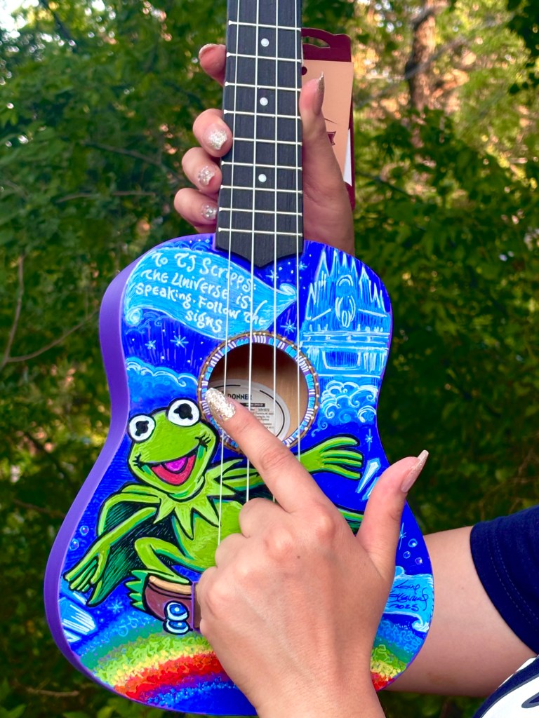 When legendary cartoonist Guy Gilchrist (Jim Henson’s cartoonist) picks up his tools, magic happens—and this time, the magic comes in the form of a ukulele. Known for his iconic work on The Muppets, Nancy, and The Pink Panther, Guy is now handcrafting a one-of-a-kind instrument just for me. And it’s not just any design—this ukulele features Kermit the Frog riding a skateboard to the stars.