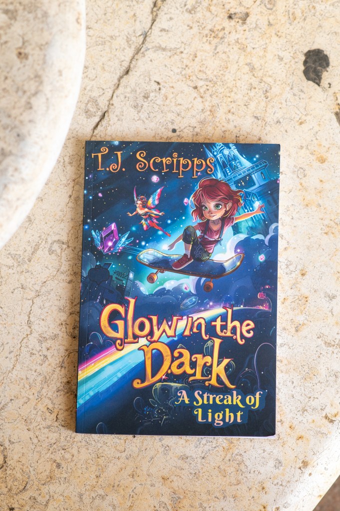 It’s an ode to the storyline of my book, Glow in the Dark: A Streak of Light, where my protagonist Ruby Diamond rides Rainbow Road to Starland, a floating school where she’s taught the secrets of the universe. Ruby’s world is all about aura power, prisms, gemstones, and the healing magic of nature’s treasures—themes that resonate deeply with the cosmic joy and wonder Guy brings to life in his art.